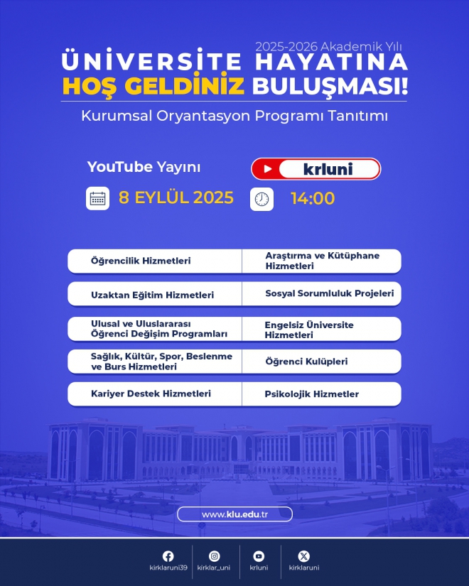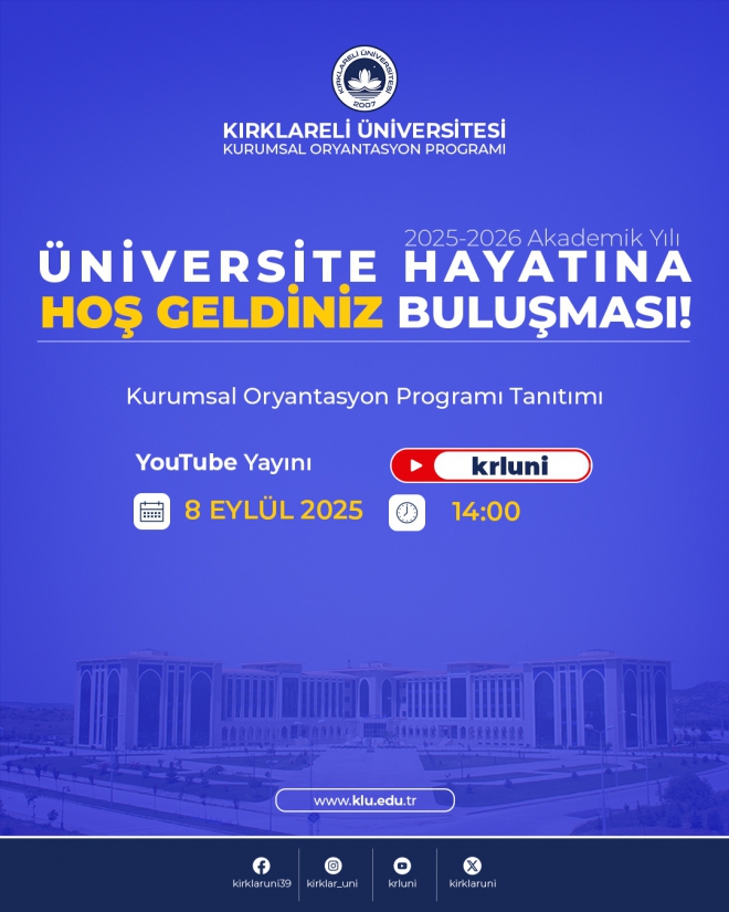 Üniversitemiz öğrencilerinin kurumsal işleyişi yakından tanımaları ve üniversite yaşamına daha hızlı uyum sağlayabilmeleri amacıyla Kurumsal Oryantasyon Programı düzenlenecektir.