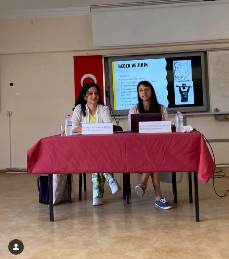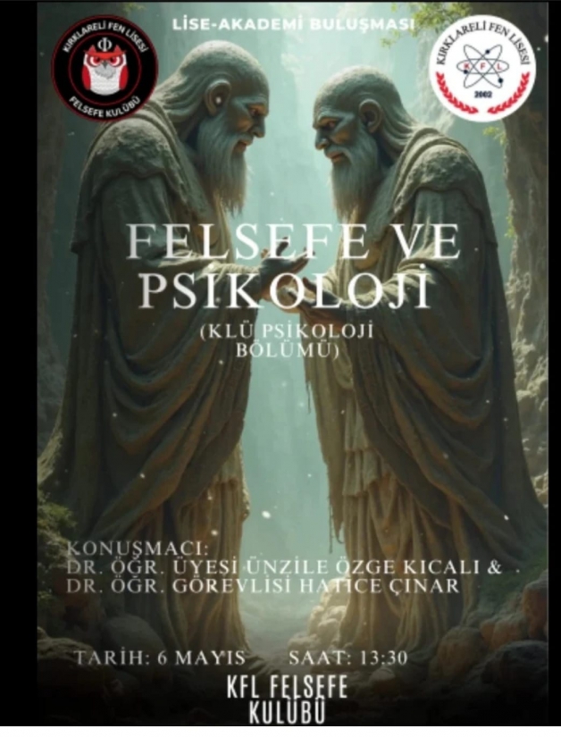 Kırklareli Üniversitesi Fen-Edebiyat Fakültesi Psikoloji Bölümü öğretim üyeleri Dr. Öğr. Gör. Hatice ÇINAR (konuşmacı) ve Dr. Öğr. Üyesi Ünzile Özge KICALI (moderatör) tarafından, Kırklareli Fen Lisesi Felsefe Kulübü’nün talebi üzerine "Felsefe ve Psikolojinin Buluşması: Beden- Zihin Dualizmi" başlıklı bir seminer düzenlenmiştir.