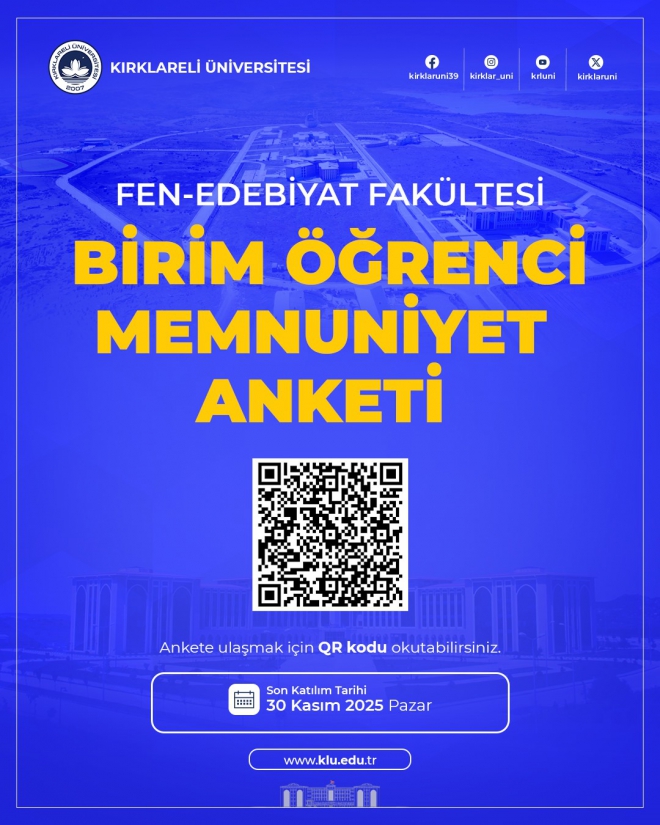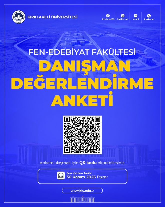 Fakültemizde kayıtlı öğrencilerin memnuniyet düzeylerini ölçmek amacıyla “Birim Öğrenci Memnuniyet Anketi” ve “Danışman Değerlendirme Anketi” hazırlanmıştır. Bölümümüzde kayıt tüm öğrencilerin ilgili anketleri doldurmaları önemle rica olunur. Anketlere son katılım tarihi 30.11.2025'tir. Aşağıdaki linklere tıklayarak ya da QR kodları aracılığıyla anketlere katılım sağlayabilirsiniz.