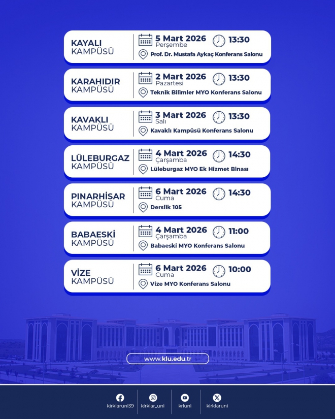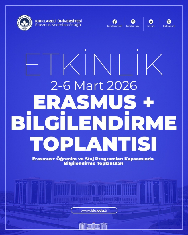 Üniversitemiz öğrenci ve personeline (akademik ve idari) yönelik olarak Erasmus+ Programı Bilgilendirme Toplantıları düzenlenecektir. 5 Mart 2026 Perşembe günü saat 13:30'da Prof. Dr. Mustafa Aykaç Konferans salonu (Merkezi Derslik 3) gerçekleştirilecek olan toplantıya, başta Erasmus koordinatörleri olmak üzere tüm öğrencilerimiz ve personelimiz davetlidir.