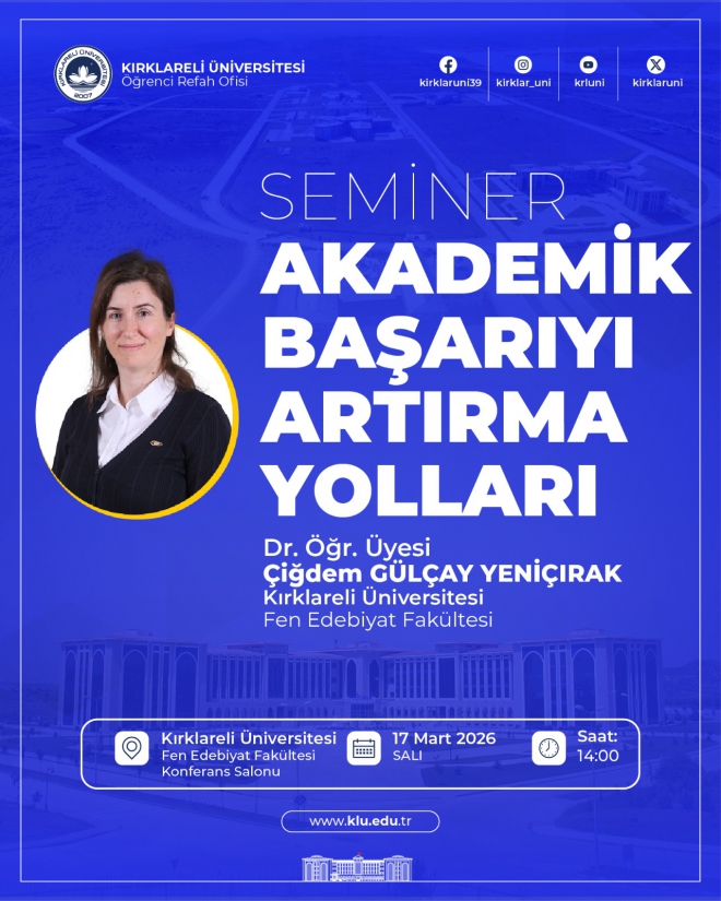 17 Mart 2026 Salı günü saat 14.00'te 1. Merkezi Derslik FEF Konferans Salonunda düzenlenecek olan seminerde bölümümüz öğretim üyelerinden Dr. Üyesi Çiğdem GÜLÇAY YENİÇIRAK konuşmacı olarak yer alacaktır. Seminerde etkili ders çalışma yöntemleri, belleği güçlendirme teknikleri ve öğrenilen bilgilerin daha kalıcı hâle gelmesini sağlayan çalışma stratejileri ele alınacaktır.